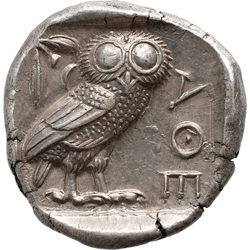 Obverse: head of Athena right, wearing earring, necklace, and crested Attic helmet decorated with three olive leaves over visor and spiral palmette