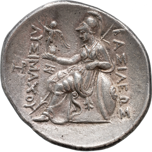 Reverse: BAΣIΛEΩΣ / ΛYΣIMAXOY, Athena Nikephoros seated left, left arm resting on shield, transverse spear in background