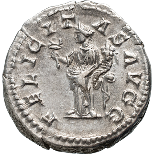 Reverse: FELICIT – AS AVG G, Felicitas standing left, holding caduceus in right hand and cornucopia in left