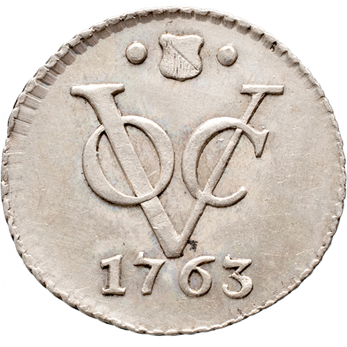 Voorzijde: stadswapentje tussen twee punten / VOC-monogram / 1763