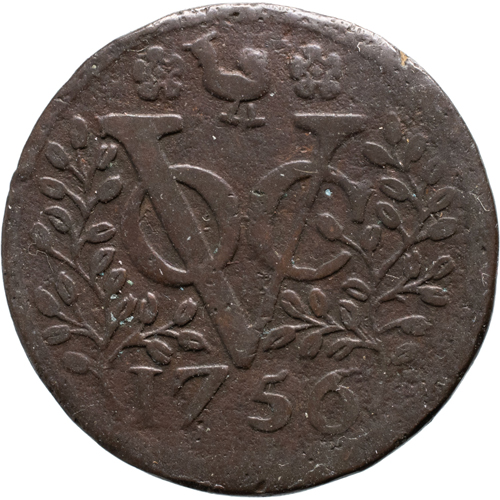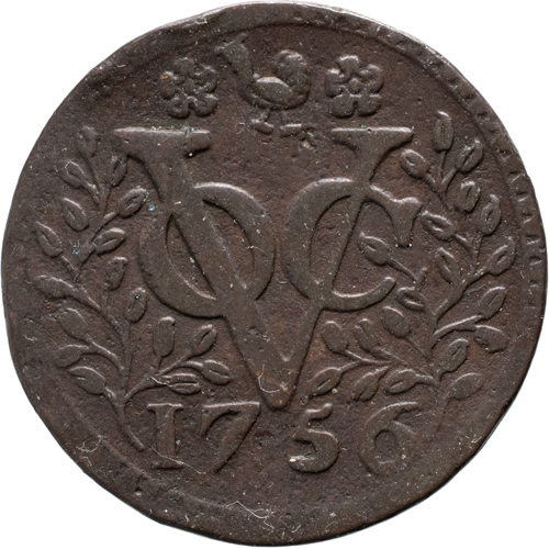 Voorzijde: haan tussen twee rozetten / VOC-monogram tussen lauwertakken / 1756