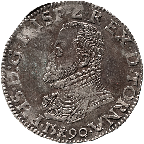 Voorzijde: . PHS. D: G. HISP. Z. REX. D. TORNA. / 15 – 90, borstbeeld naar links