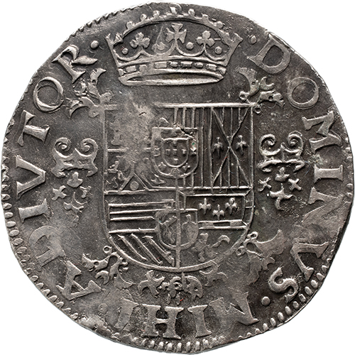 Keerzijde: . DOMINVS . MIHI . ADIVTOR ., gekroond Spaans-Oostenrijks-Bourgondisch wapen, geflankeerd door twee vuurstalen, geplaatst op een kruis van knoestige stokken en dragende het kleinood van de Orde van het Gulden Vlies
