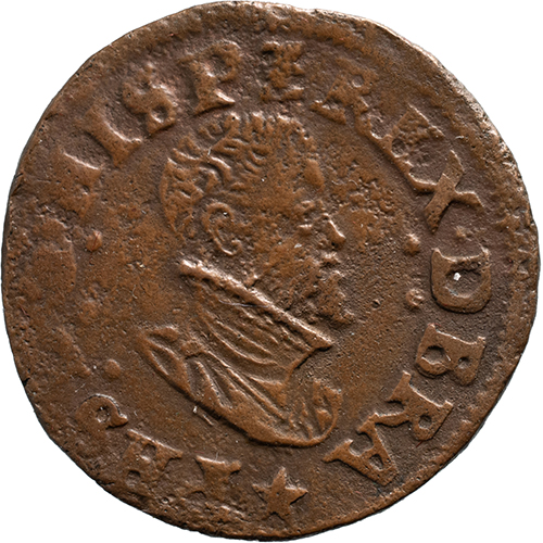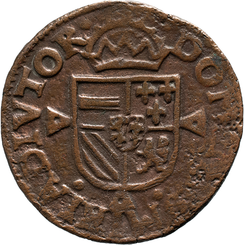 Keerzijde: DOMINVS . MI – HI . ADIVTOR, gekroond Spaans-Oostenrijks-Bourgondisch wapen