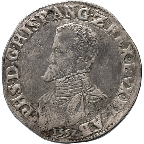 Voorzijde: .PHS.D.G.HISP.ANG.Z.REX.DVX.BRAB. / 1557, borstbeeld naar links