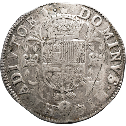 Keerzijde: DOMINVS.MIC – HI.ADIVTOR, gekroond Spaans-Oostenrijks-Bourgondisch wapen, geflankeerd door twee vuurstalen, geplaatst op een kruis van knoestige stokken en dragende het kleinood van de Orde van het Gulden Vlies